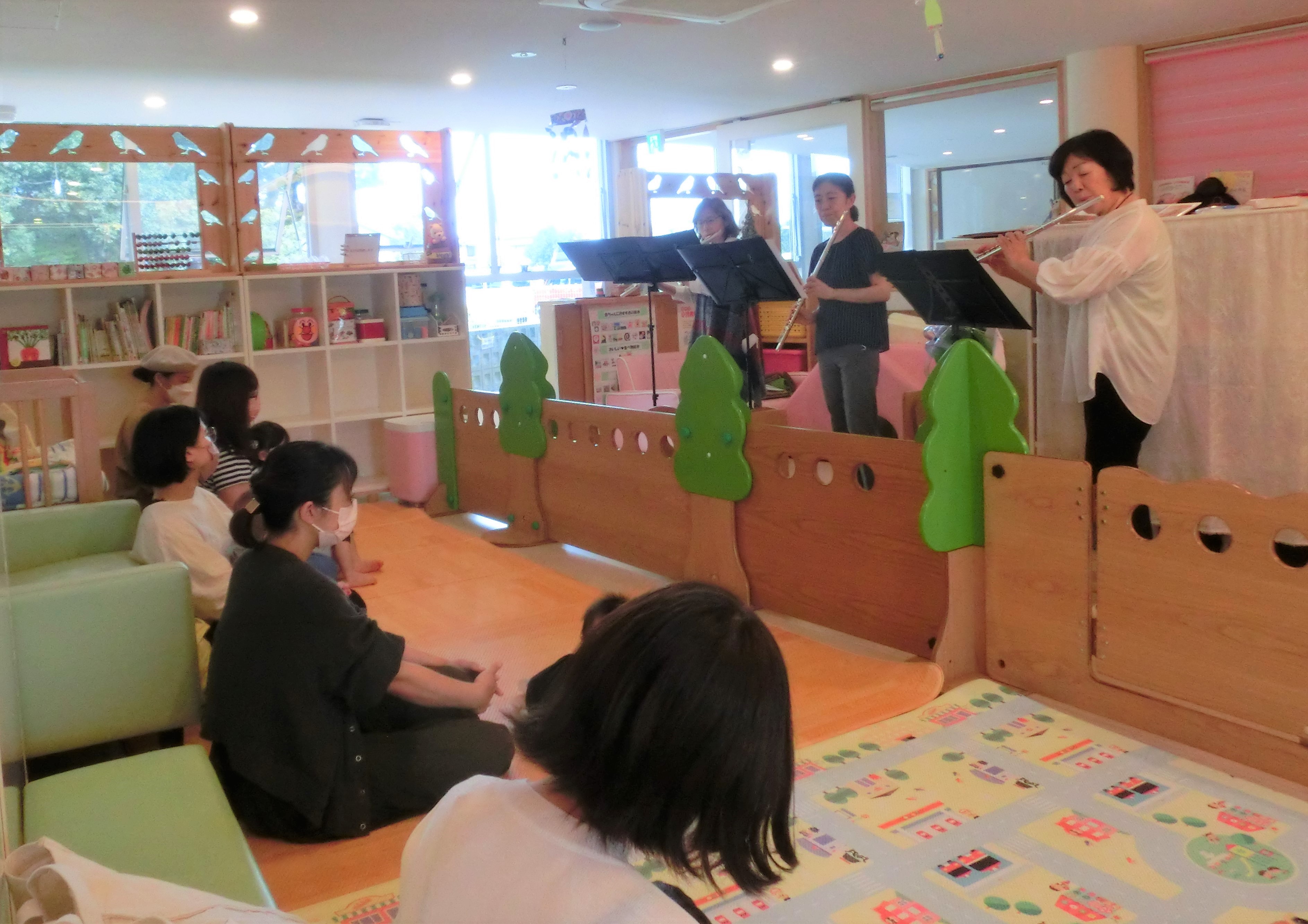 親子ふれあい遊び、絵本読み聞かせ、外遊び、バースデー、フルート演奏、赤ちゃんの日、はじめてさんの日、手作りの日、自由遊びなど